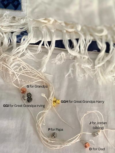 Family members' threads are labeled with their initial, added to the honorees tallit, and re-tied with intention and meaning.